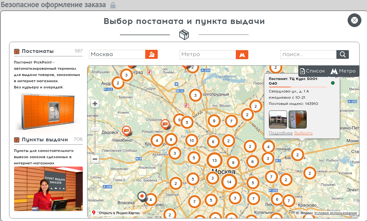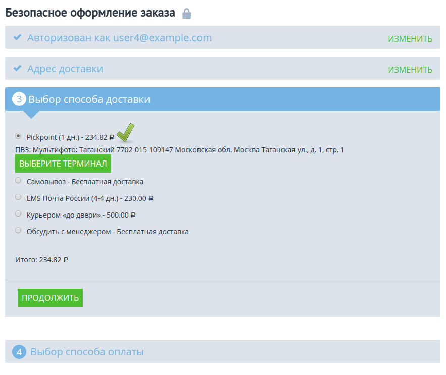 В окне оформления заказа выберите способ доставки “Pickpoint”.
