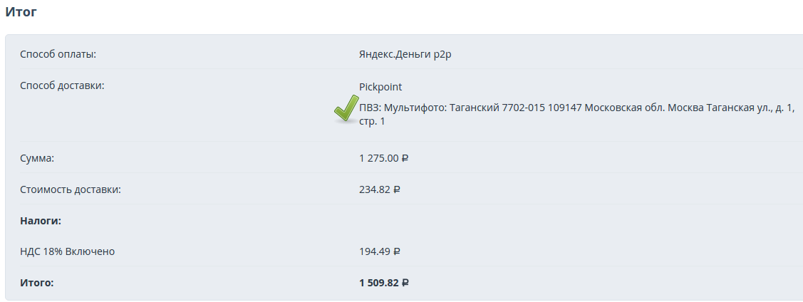 Для оформленного заказа в способе доставки должен быть указан адрес выбранного терминала.