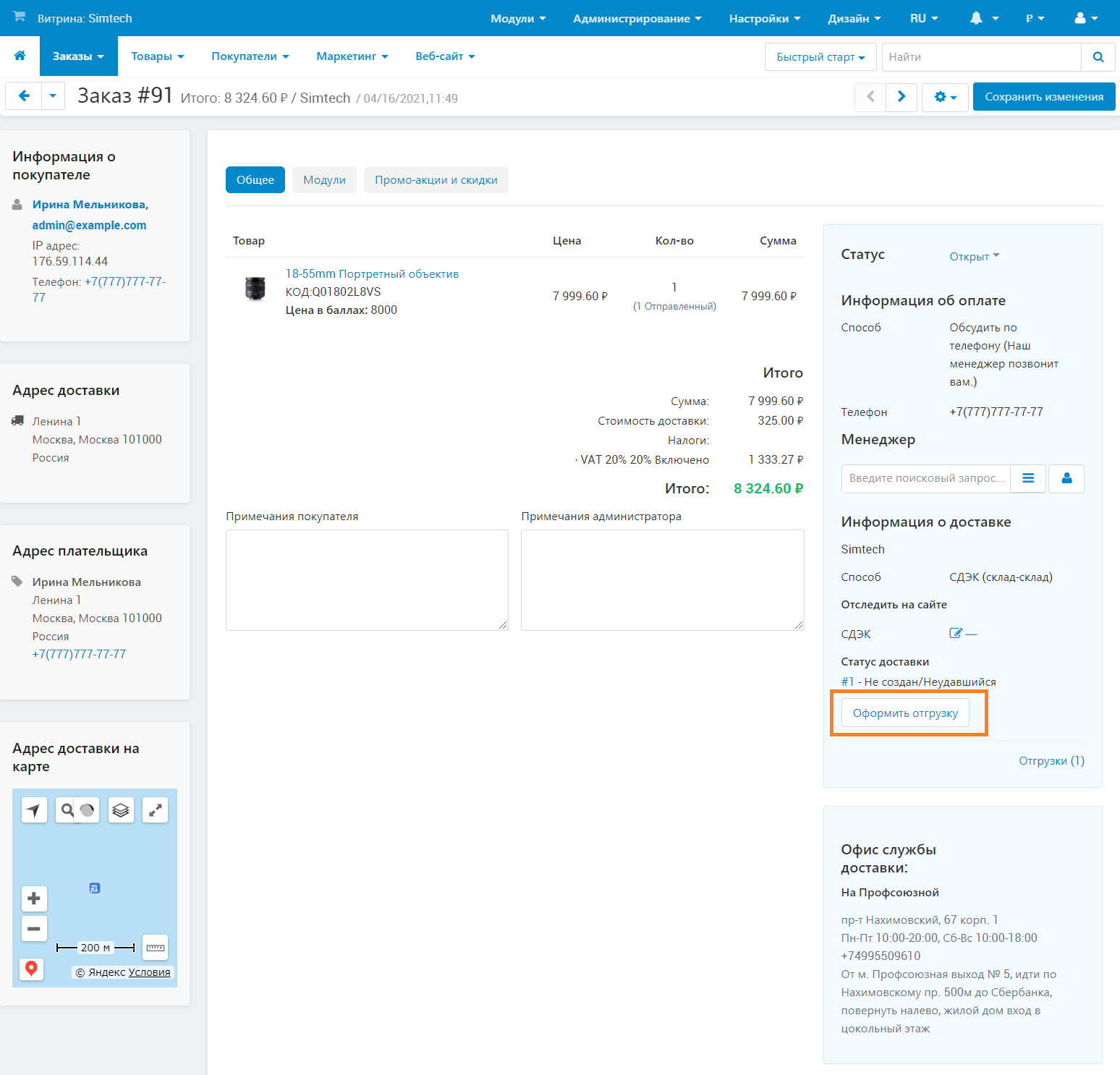 После того, как отгрузка будет создана, на странице заказа появится кнопка Оформить отгрузку. Нажмите на неё.