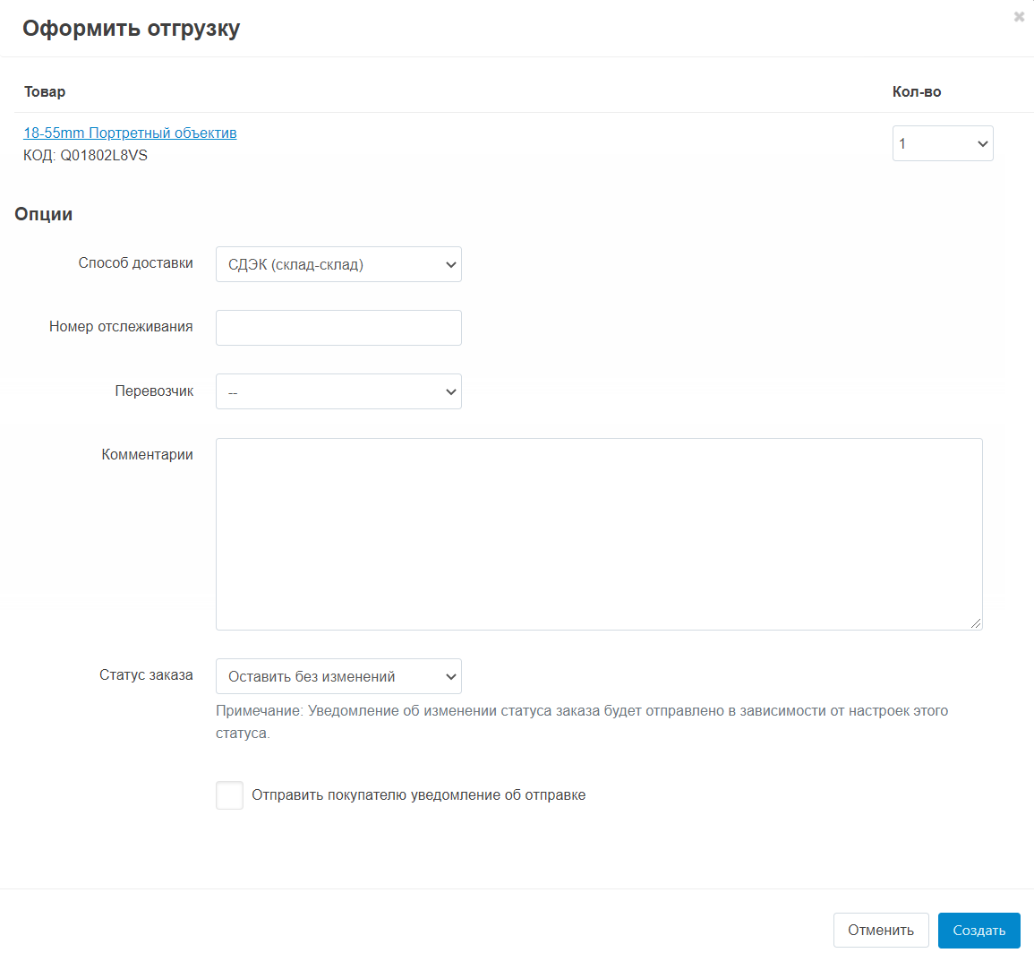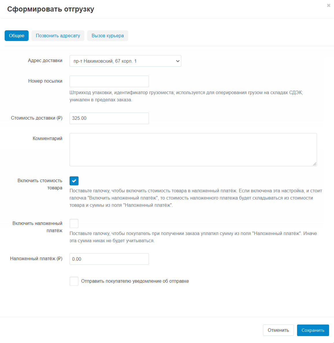 Откроется всплывающее окно, в котором вы сможете оформить отгрузку в СДЭК. В окне есть несколько вкладок: