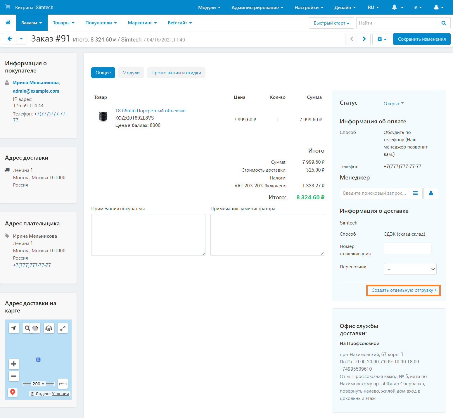 Сначала нужно создать отгрузку в CS-Cart. Для этого нажмите Создать отдельную отгрузку.