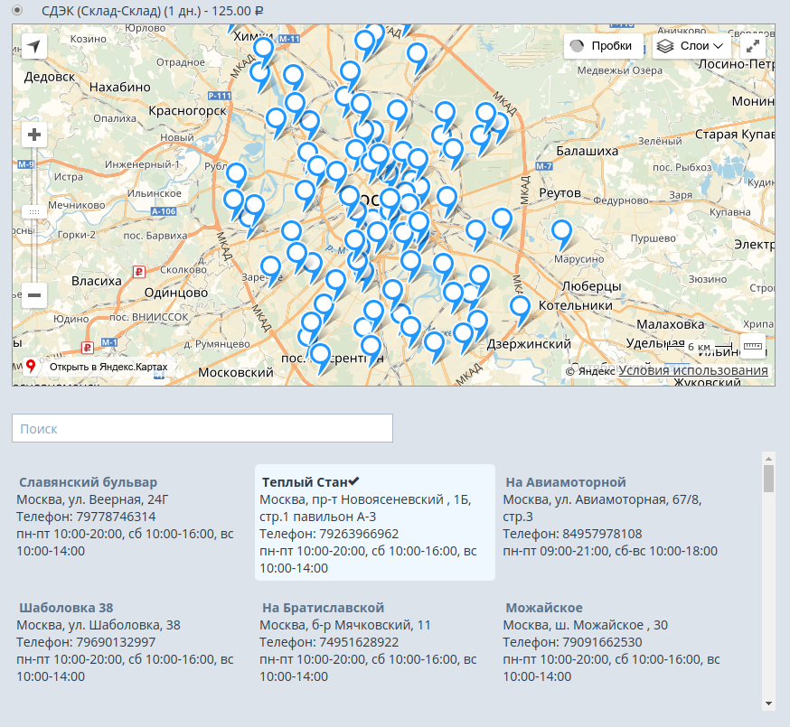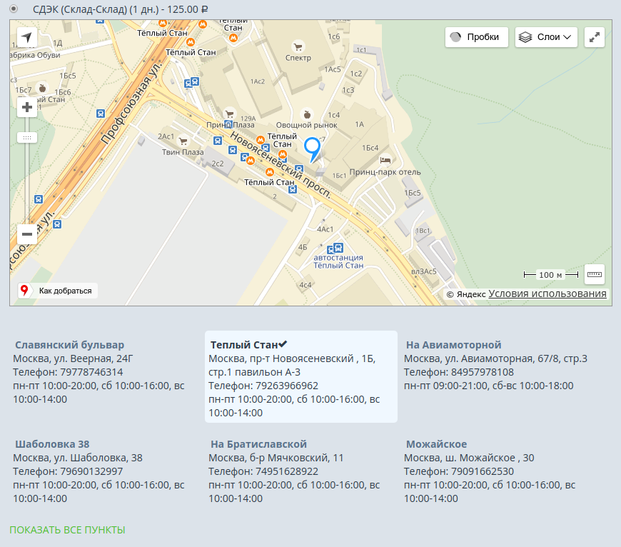 Теперь на витрине должен отображаться новый способ доставки, которым сможет воспользоваться покупатель. Если выбран один из тарифов “Склад — Склад”, то покупатели увидят карту и смогут выбрать подходящий пункт выдачи заказов.