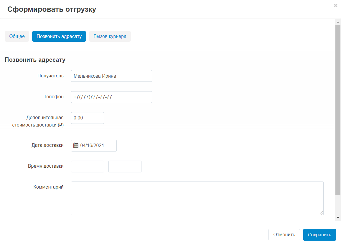 Вкладка Позвонить адресату: введите данные для уведомления покупателя о поступлении заказа; если не указывать время доставки, то данные с этой вкладки учтены не будут.