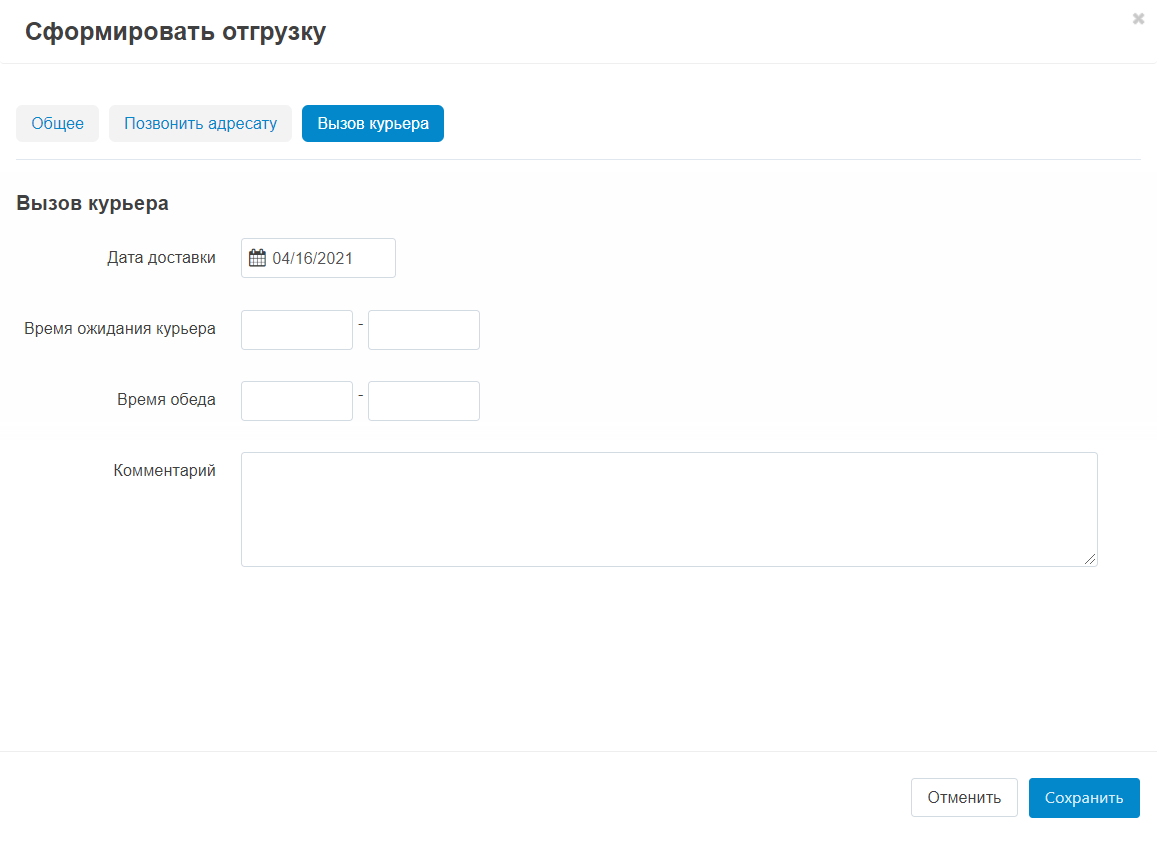 Вкладка Вызов курьера: введите данные для курьерской доставки; если не задать время ожидания курьера, то данные с этой вкладки учтены не будут.