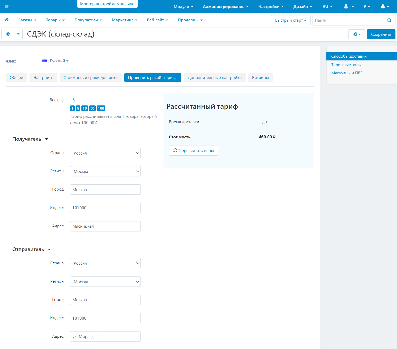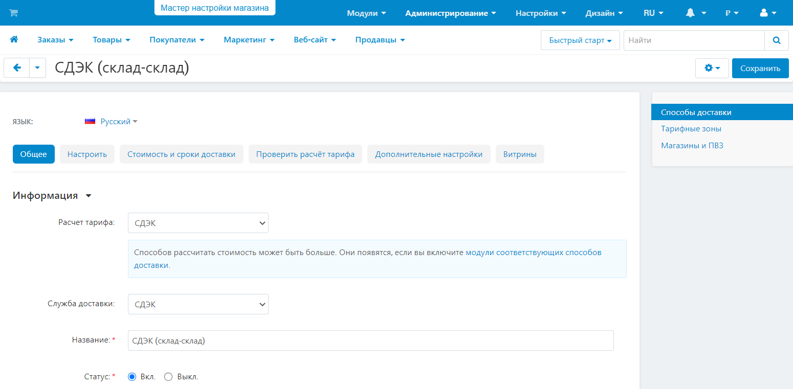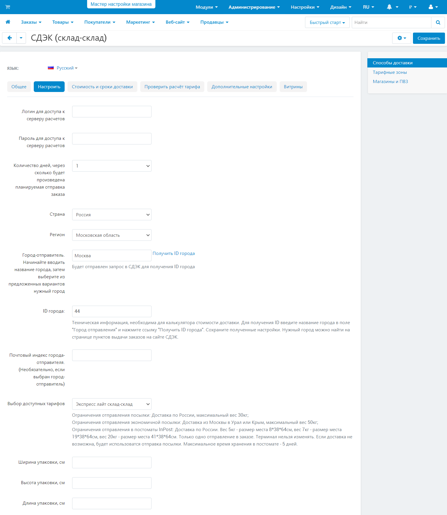 Выбор доступных тарифов — у СДЭК есть множество тарифов. Выбор тарифа влияет на стоимость доставки.