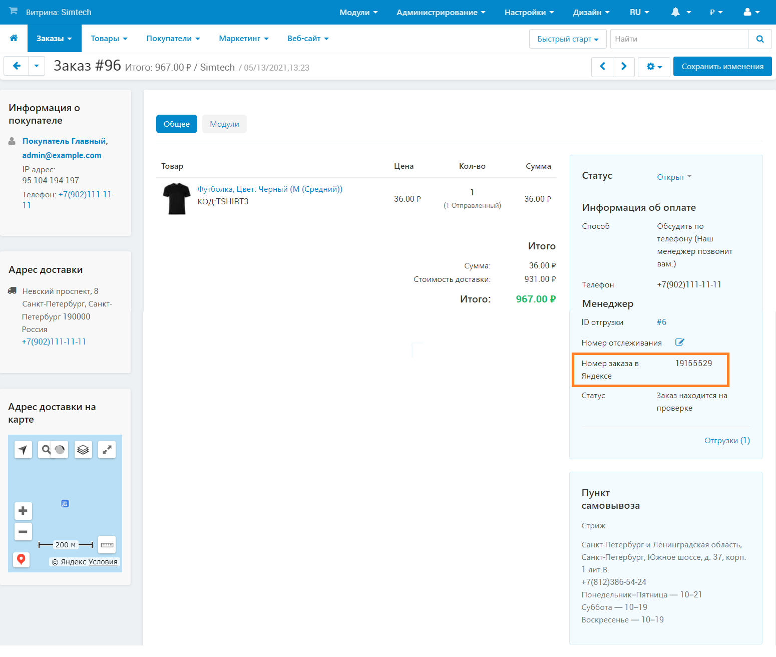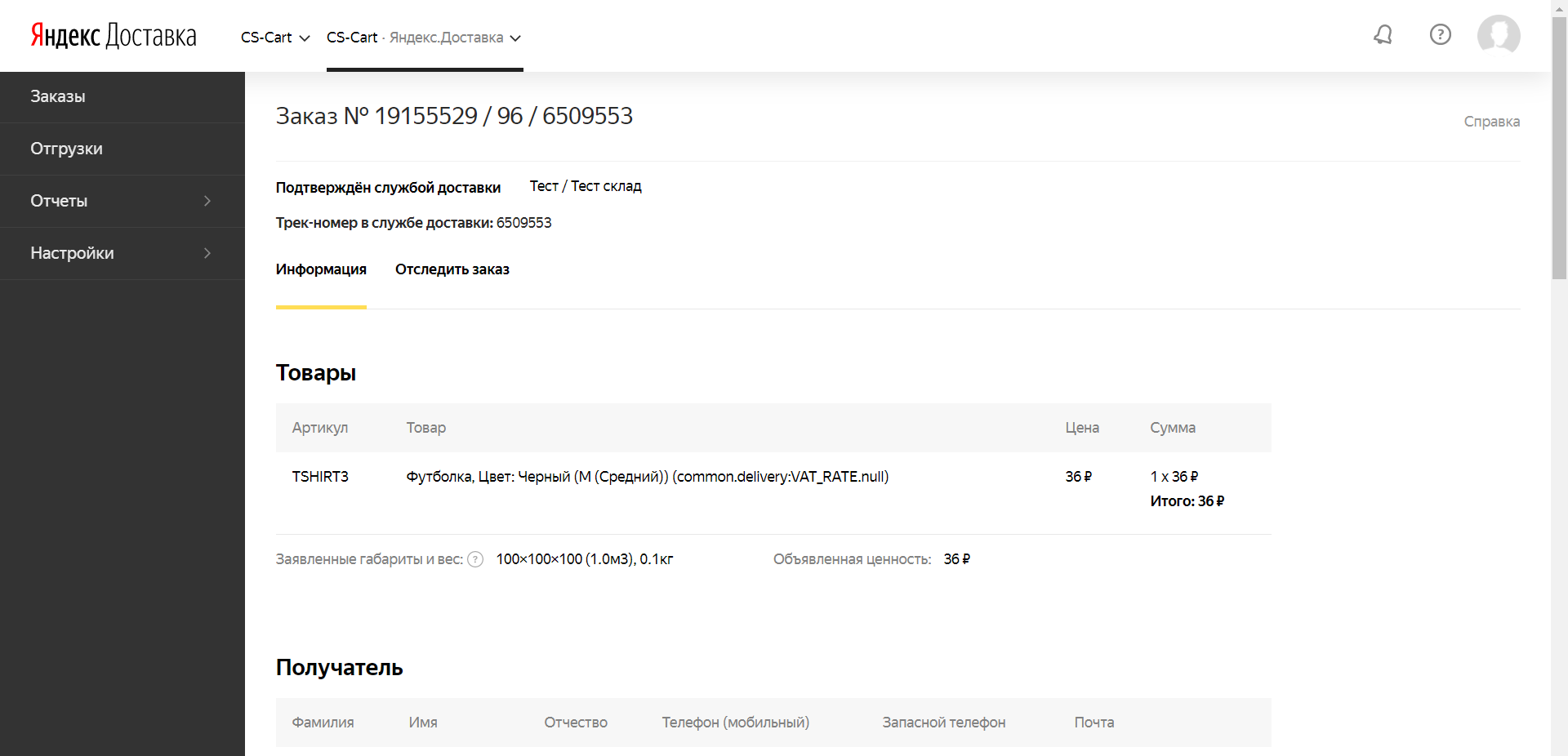 Нажмите кнопку Создать. Заказ в Яндекс.Доставке будет создан, а на странице заказа в CS-Cart появится номер этого заказа в Яндексе.