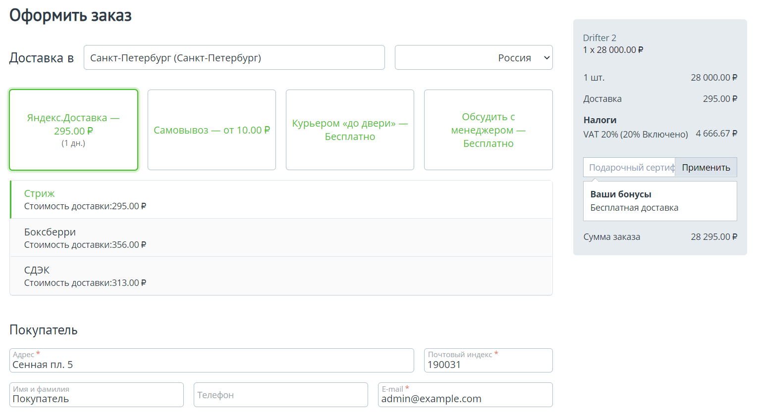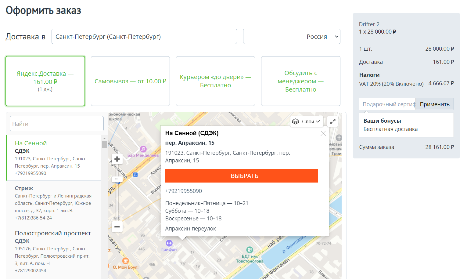 Выбор способа доставки может выглядеть по-разному, в зависимости от типа доставки: