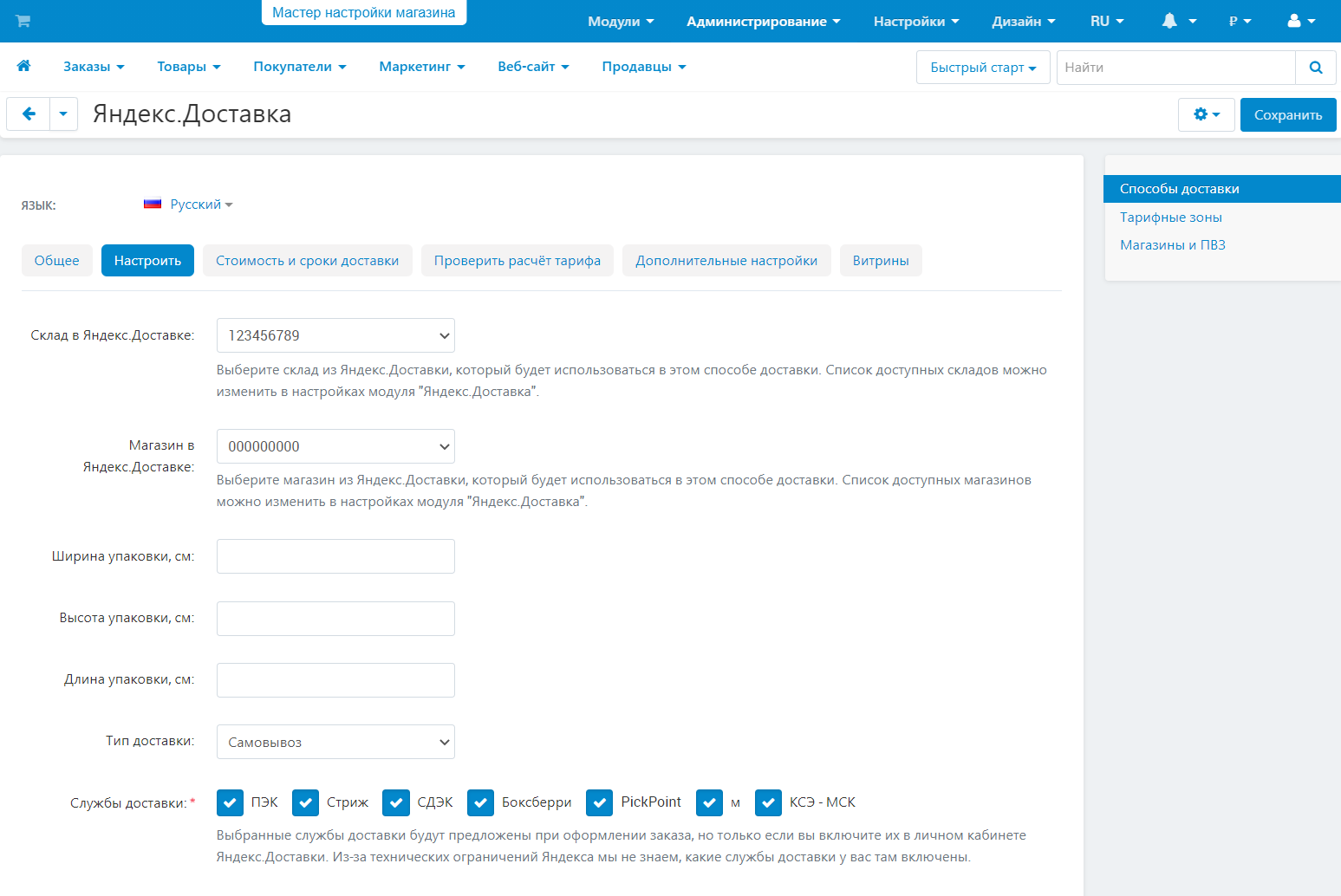 Склад, магазин в Яндекс.Доставке Выберите склад/магазин из списка доступных, который вы добавили при настройке модуля “Яндекс.Доставка”. Ширина упаковки, высота упаковки, длина упаковки Значения размера посылки по умолчанию. Тип доставки Курьерская доставка или доставка до пункта самовывоза. Службы доставки Службы доставки, которые можно будет выбрать при оформлении и редактировании заказа. Здесь появляются только те службы, которые включены у вас в личном кабинете Яндекс.Доставки.