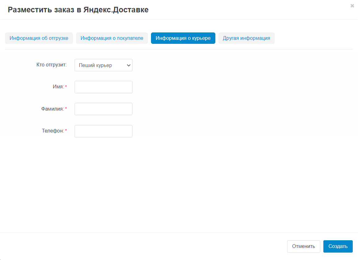 Вкладка Информация о курьере: пеший курьер или на машине (также марка и номер автомобиля), имя, фамилия и телефон курьера.