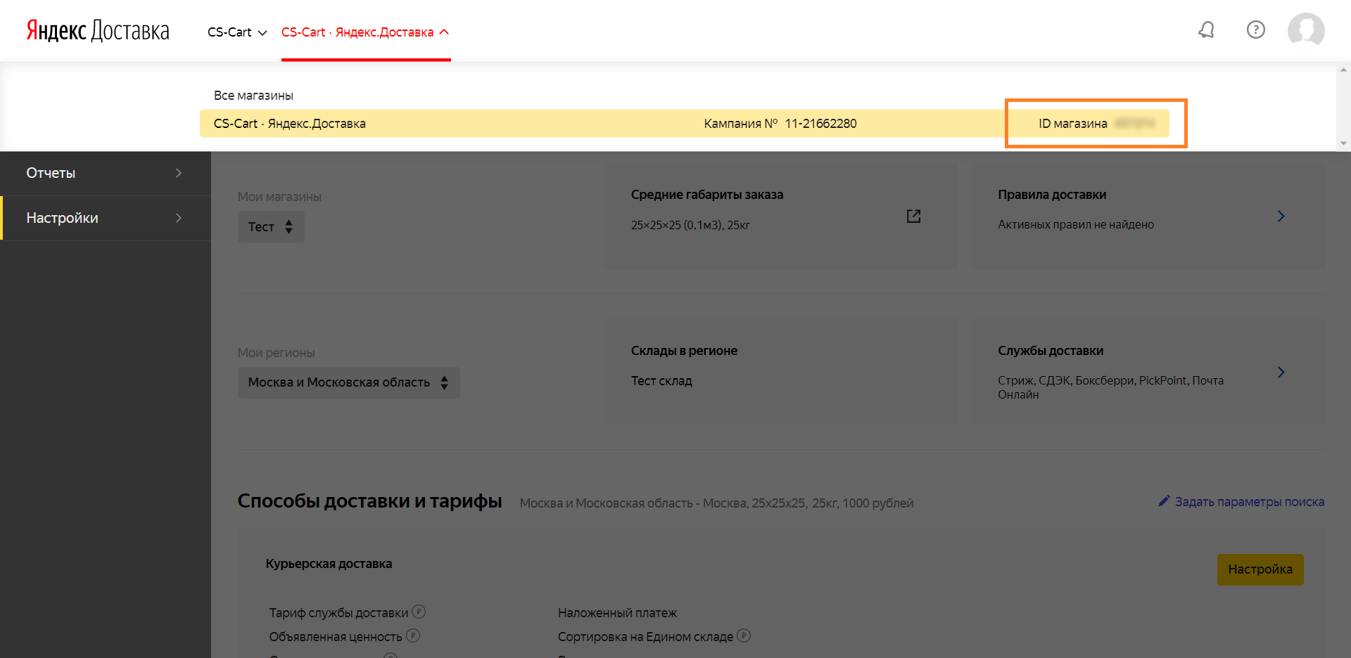 Идентификаторы магазинов и Идентификаторы складов из Яндекса — в этих полях вы также можете вписать название магазина/склада рядом с ID для более удобной навигации. Чтобы получить идентификаторы магазинов или складов, в личном кабинете Яндекс.Доставки перейдите на страницу Настройки → Магазины или Настройки → Склады. В строке нужного магазина/склада вы увидите значение Идентификатора.