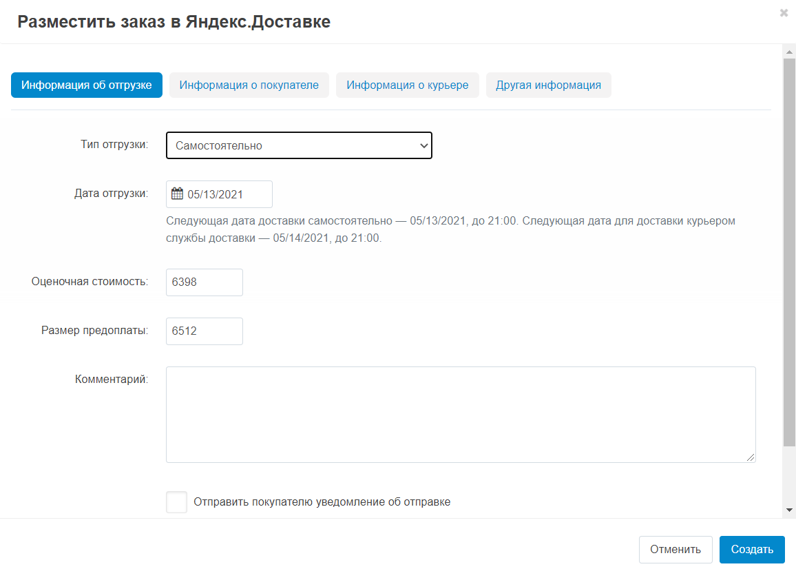 Вкладка Информация об отгрузке: выберите дату и тип отгрузки, добавьте комментарий, если необходимо. Можно отправить покупателю уведомление об отправке. Здесь есть ещё два важных поля: