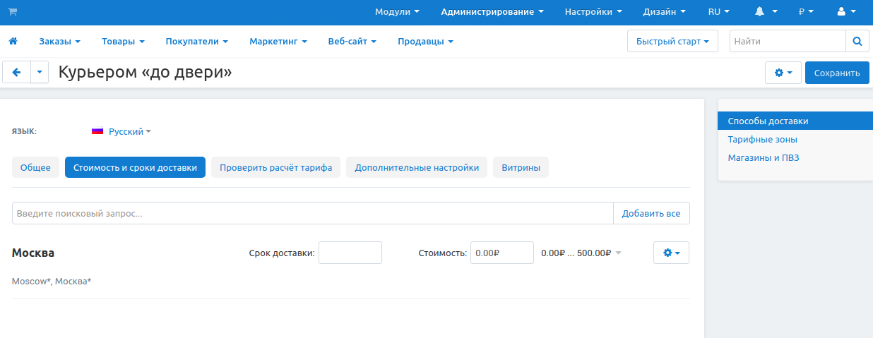 Не забудьте галочку Добавить во все способы доставки с расчётом в реальном времени при создании новой тарифной зоны. В ином случае, она автоматически привяжется ко всем существующим в магазине способам доставки c расчётом тарифа в режиме реального времени. Если вы не хотите предлагать способы доставки в этой тарифной зоне, вам придётся отвязывать её вручную.