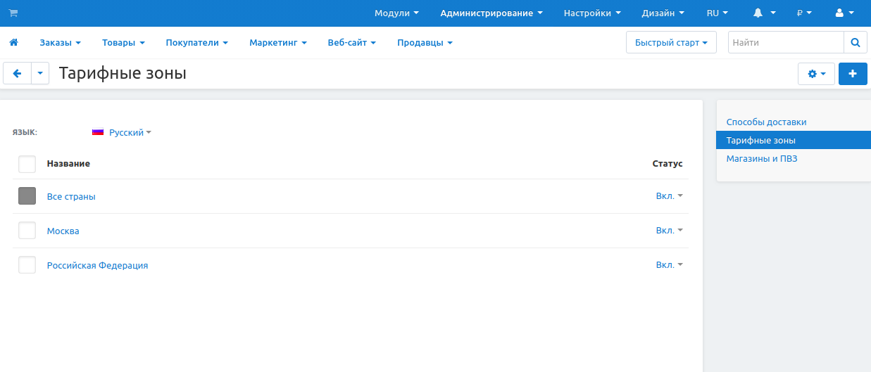 Откройте страницу Администрирование → Доставка и налоги → Тарифные зоны.
