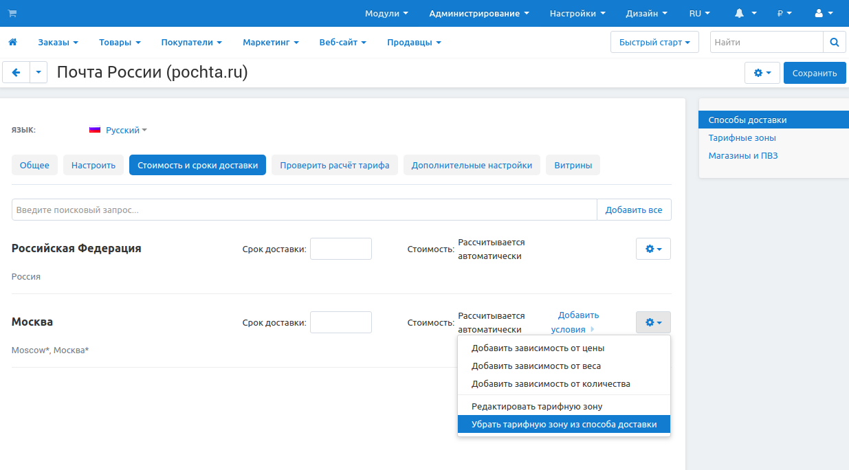 - Если вы создали способ доставки с расчётом тарифа в режиме реального времени: отвяжите все остальные тарифные зоны, кроме Российская Федерация.