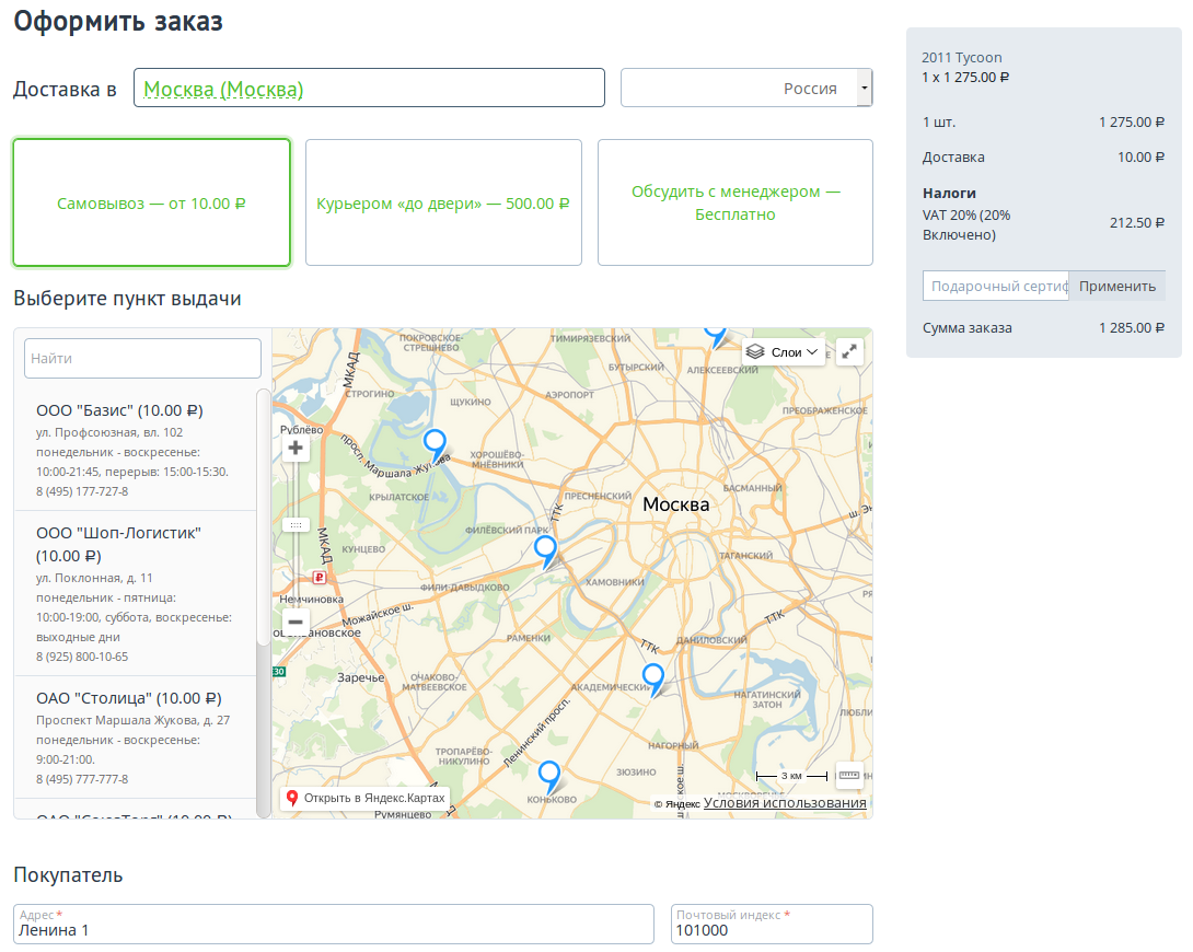 Покупатель сможет выбрать удобный ему способ доставки на странице оформления заказа. Выбор способов доставки можно переместить в нужное место страницы или скрыть вообще. Делается это на странице Дизайн → Макеты на вкладке Оформить заказ.