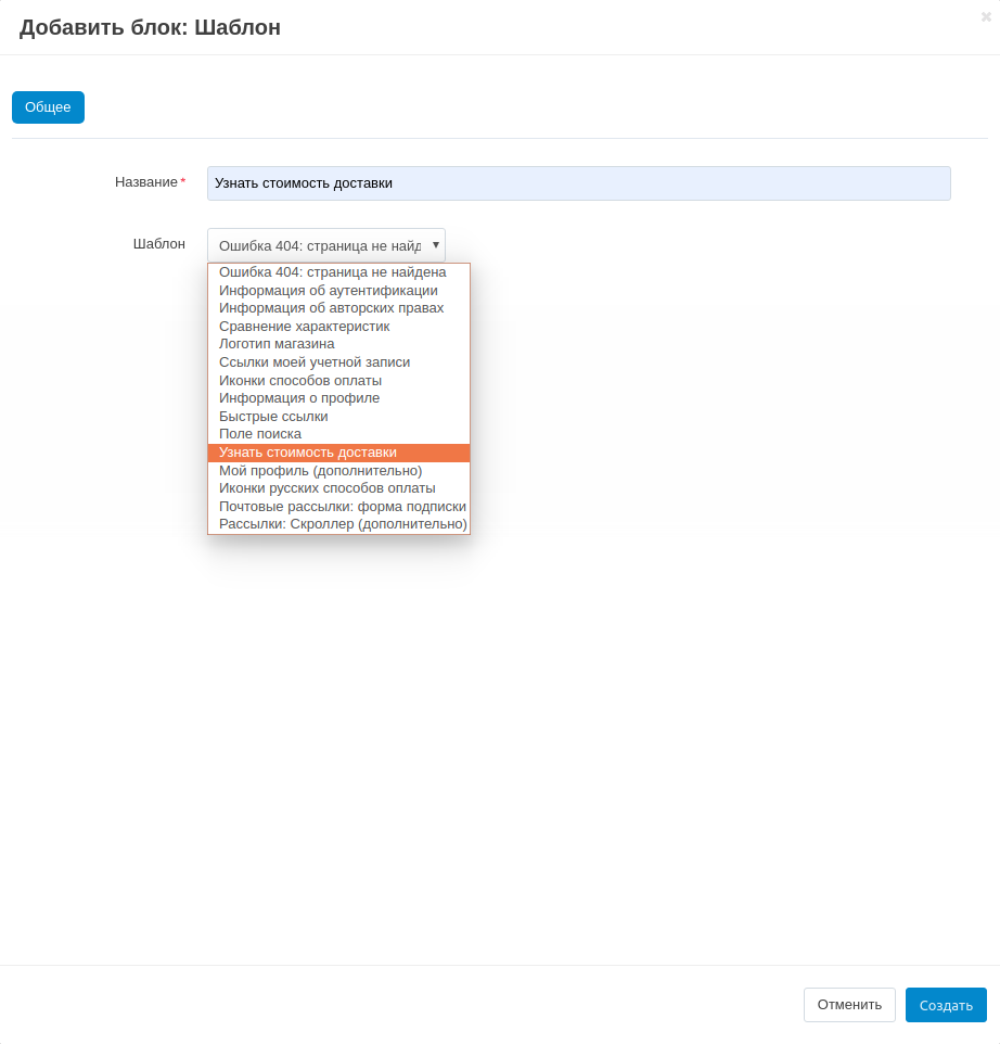 Создайте новый блок Шаблон с шаблоном Узнать стоимость доставки в любой секции.