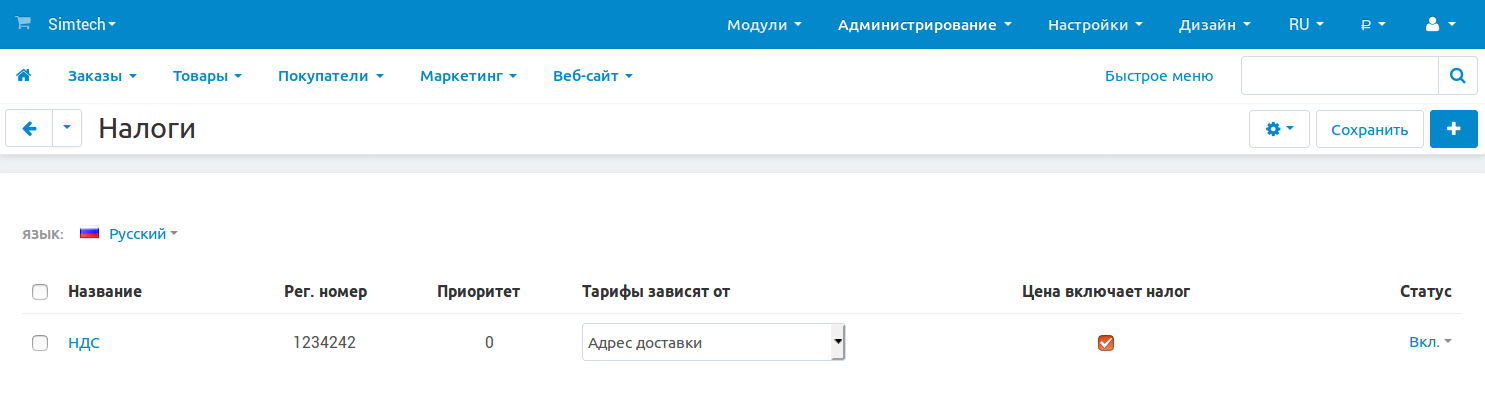 Чтобы включить или выключить налог, поменяйте его статус на Вкл. или Выкл. соответственно.