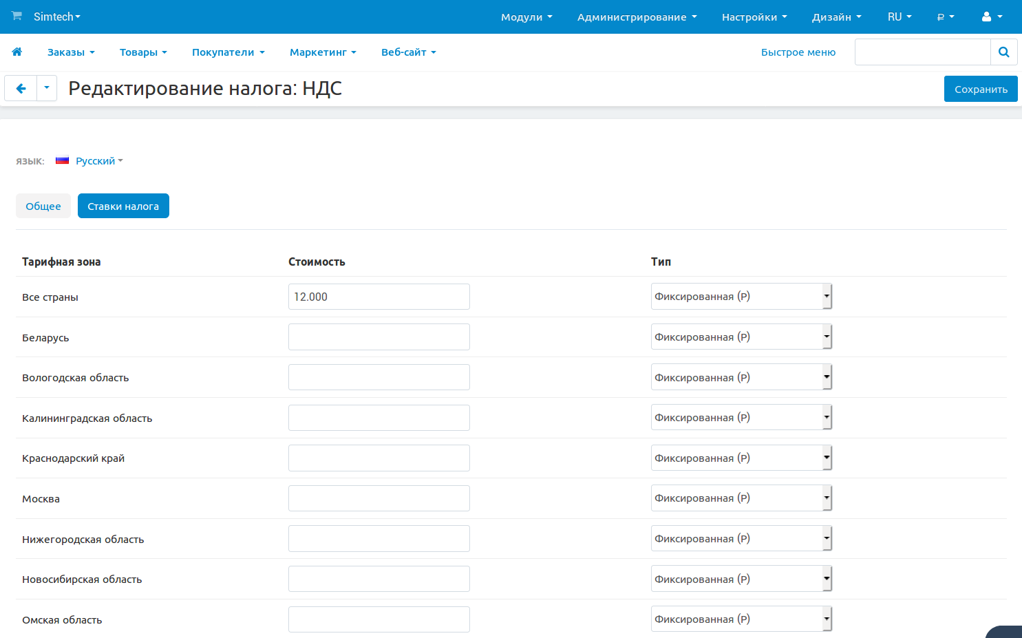 Откройте страницу Администрирование → Доставка и налоги → Тарифные зоны и создайте тарифные зоны. Они понадобятся, если вы захотите указать разные налоговые ставки для покупателей из разных стран или регионов.