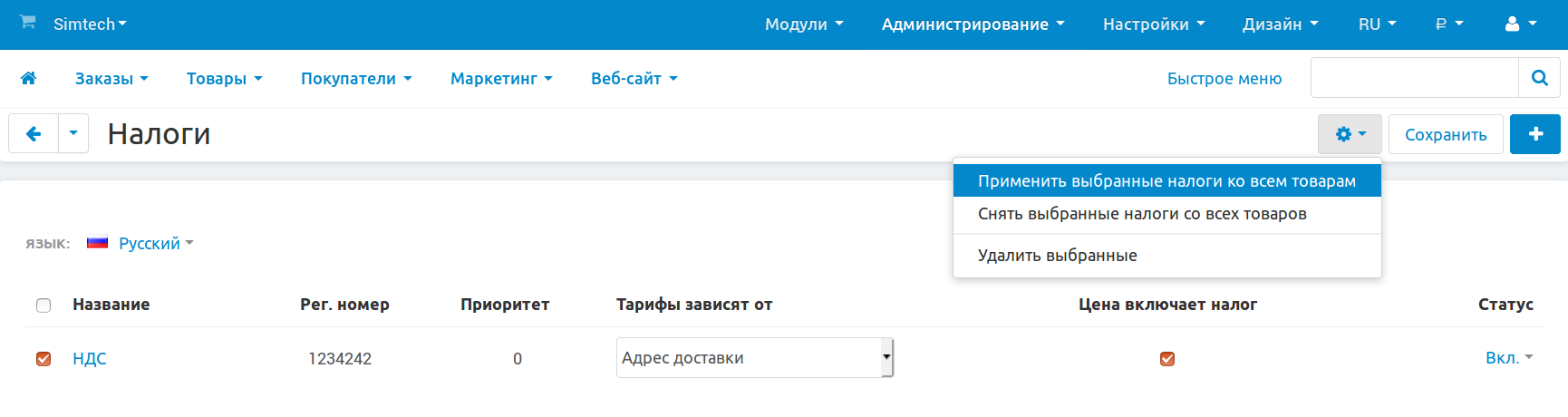 Применить налоги также можно с помощью импорта товаров. В отдельной статье мы рассказываем об оформлении импортируемого CSV-файла с товарами.