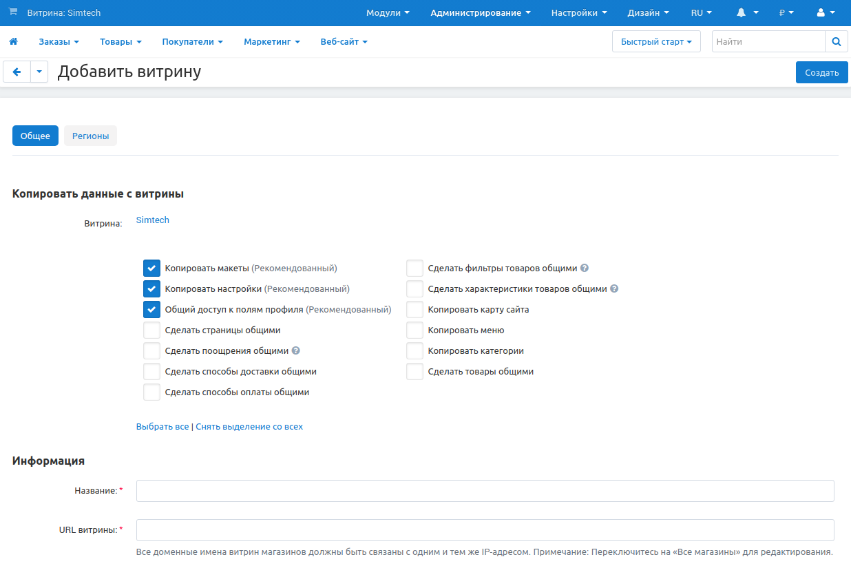 Введите информацию и настройки новой витрины.