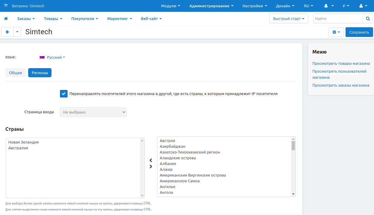 Поле справа содержит список доступных стран; поле слева содержит список стран, привязанных к выбранной витрине. Если в поле слева не указана ни одна страна, общая точка входа не будет перенаправлять покупателей на эту витрину.