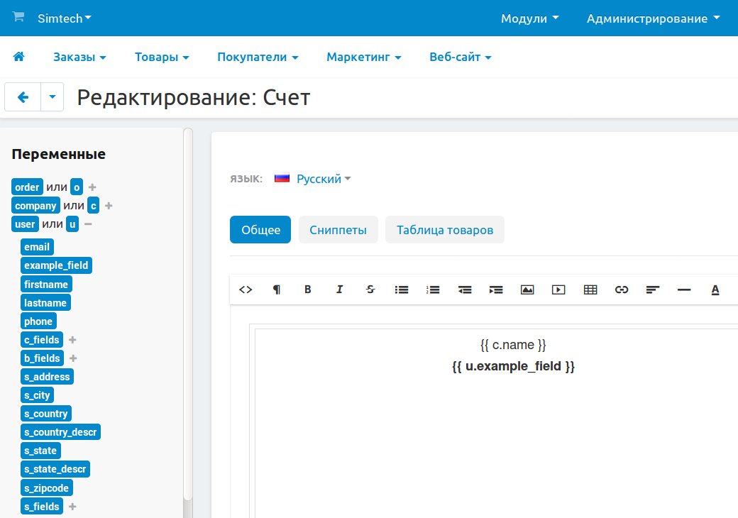 Начиная с версии 4.4.1, в CS-Cart встроен редактор документов. Он позволяет редактировать счета, упаковочные листы и другие документы. Поля профиля находятся в группе переменных user. Просто нажмите на название поля, чтобы добавить его в шаблон документа.