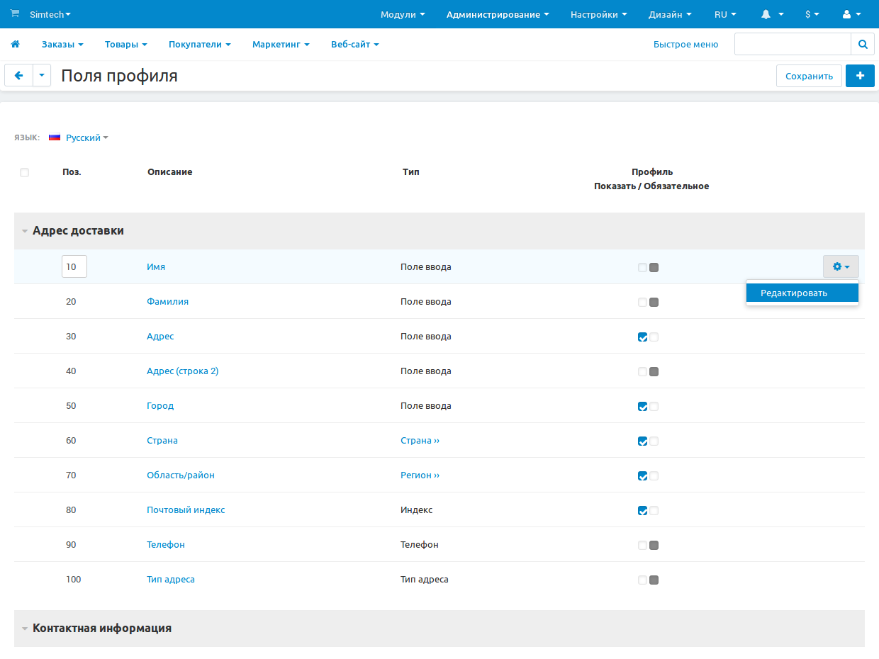 Если поле профиля относится к разделу Адрес плательщика/Адрес доставки, то галочки и кнопка Удалить будут отображаться только в подразделе Адрес доставки. Удалив поле из адреса доставки, вы также удалите его и из адреса плательщика.