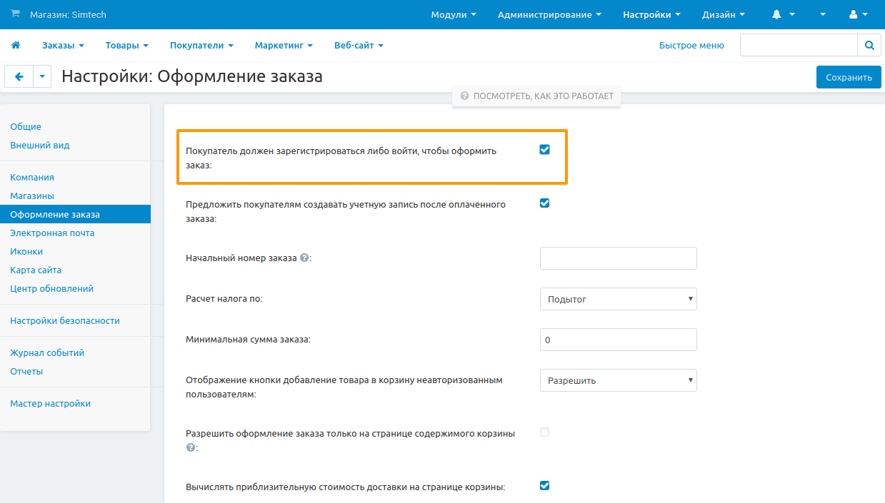2. Поставьте галочку Покупатель должен зарегистрироваться либо войти, чтобы оформить заказ.