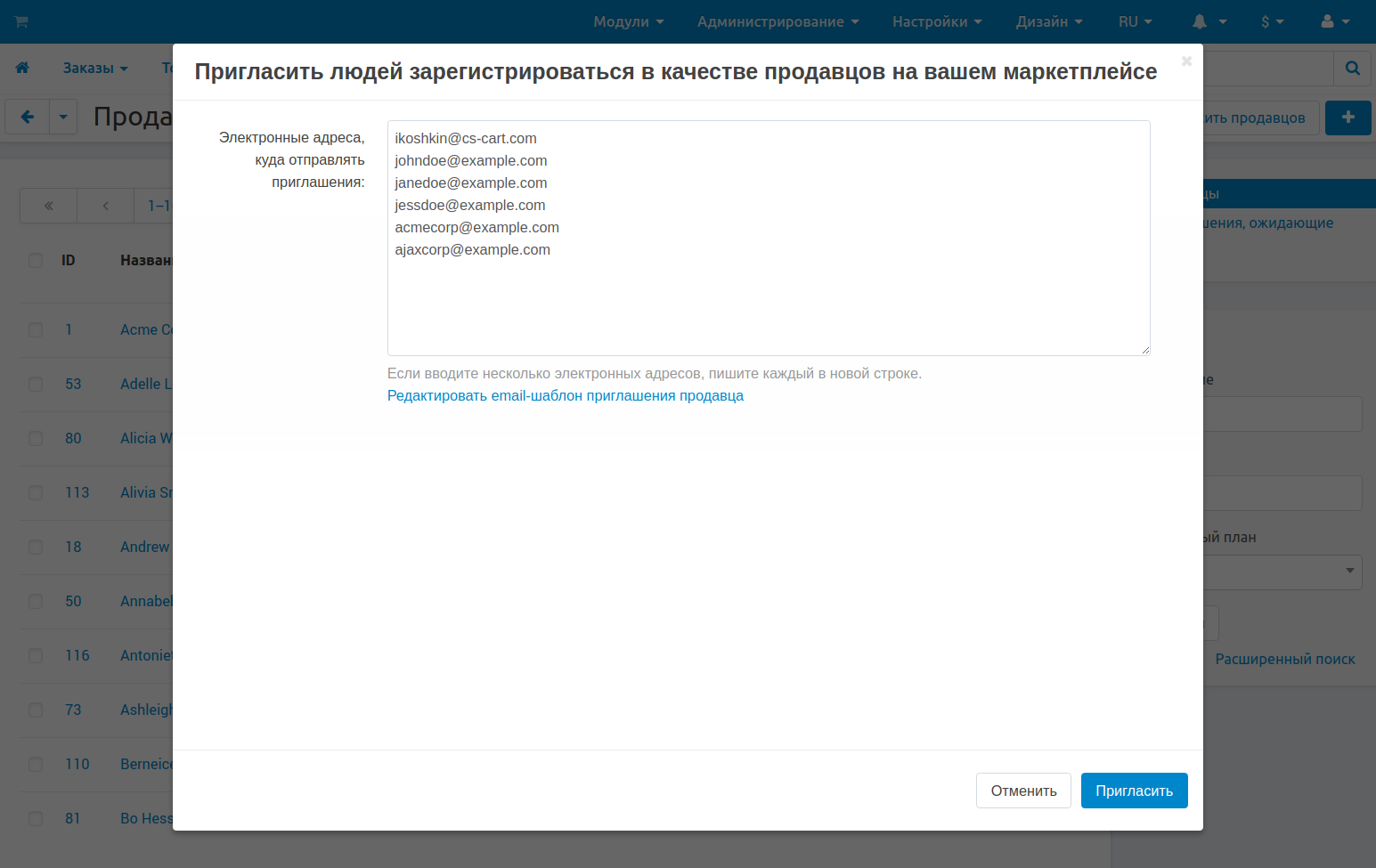 На маркетплейсе продаются товары от многих продавцов. Чем больше продавцов, тем лучше. Если у вас есть электронные адреса потенциальных продавцов, вы можете отправить им приглашения на ваш маркетплейс. Чтобы пригласить продавца: