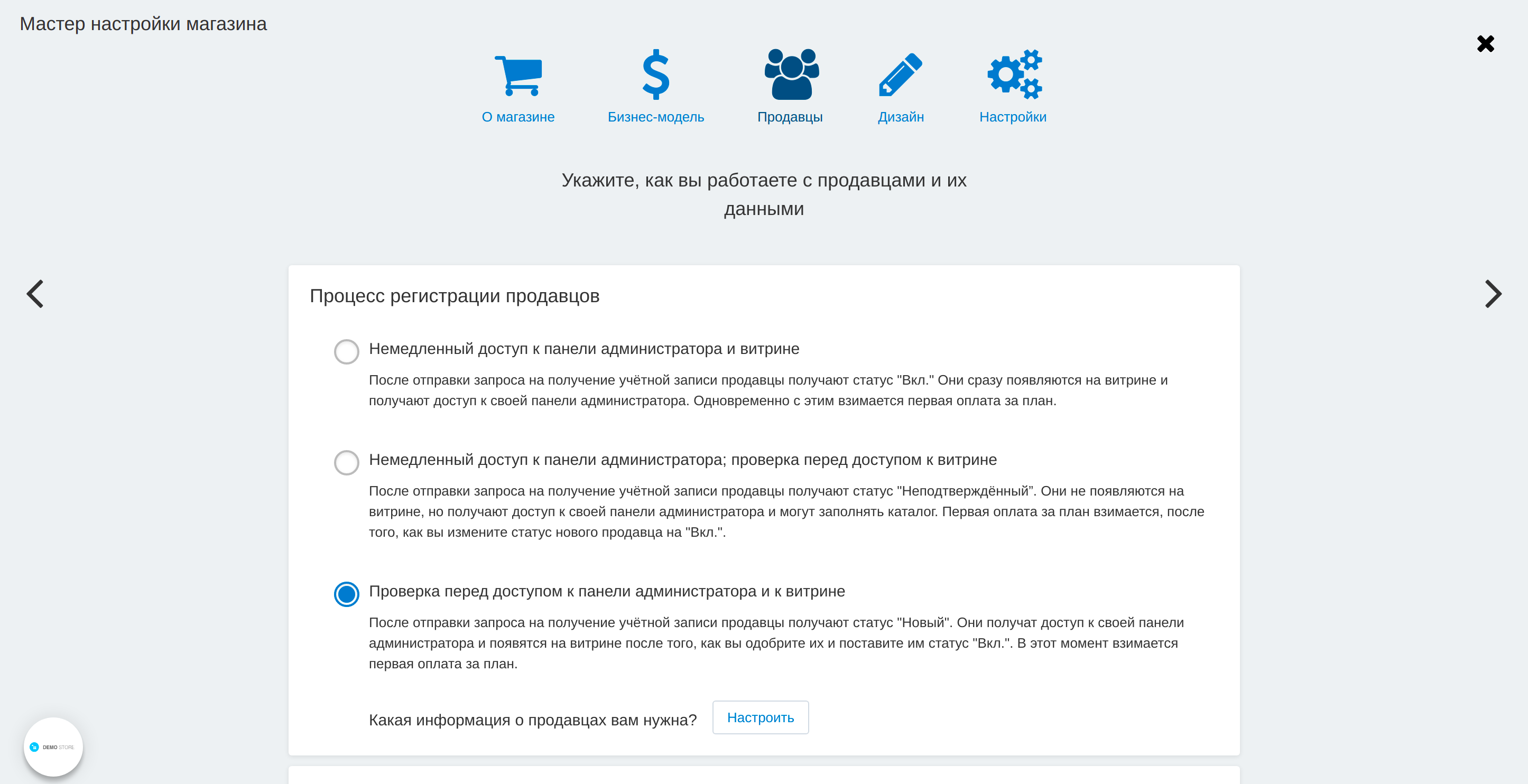 Мастер настройки ускоряет настройку маркетплейса. Статусы продавцов, значения настройки в модуле “Премодерация данных продавцов” и настройки продавцов в панели администратора меняются выбором сценария.