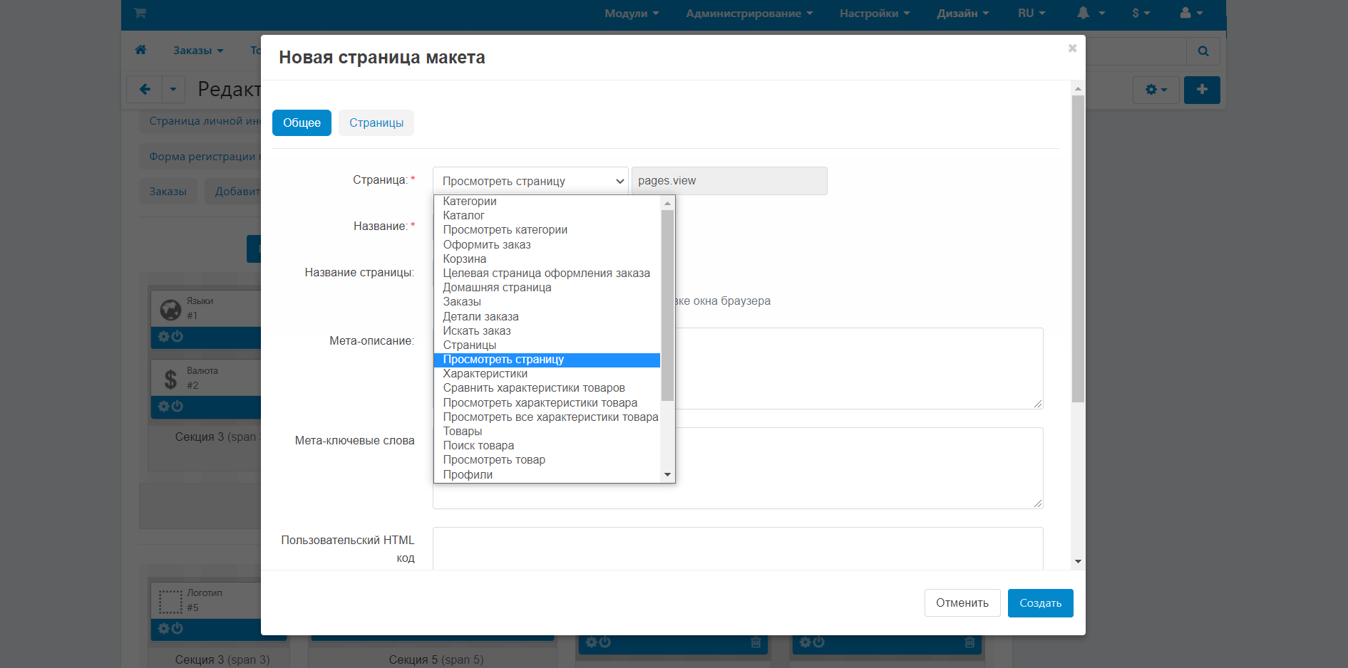 1. Нажмите на изображение шестеренки рядом с названием страницы макета. На вкладке Общее в поле Страница в выпадающем списке выберете тип Просмотреть страницу.