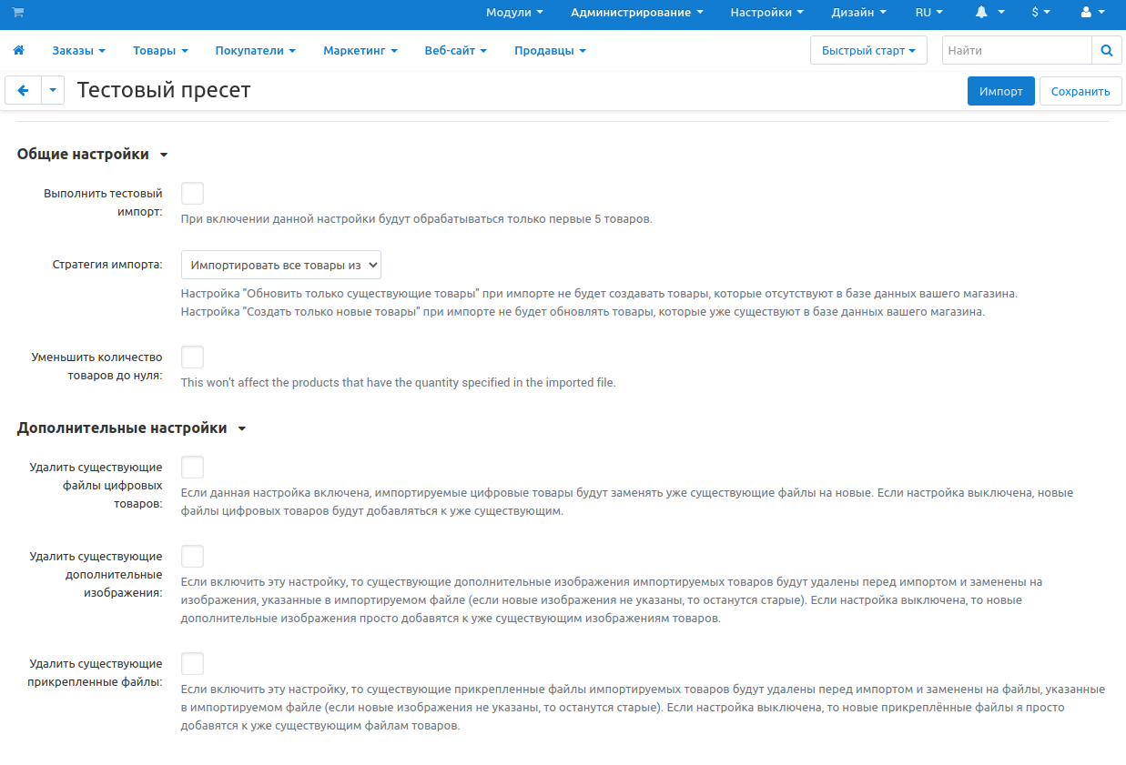 Уменьшить количество товаров до нуля — включите эту настройку, если вы хотите, чтобы во время импорта количество всех товаров в магазине было сброшено до 0.