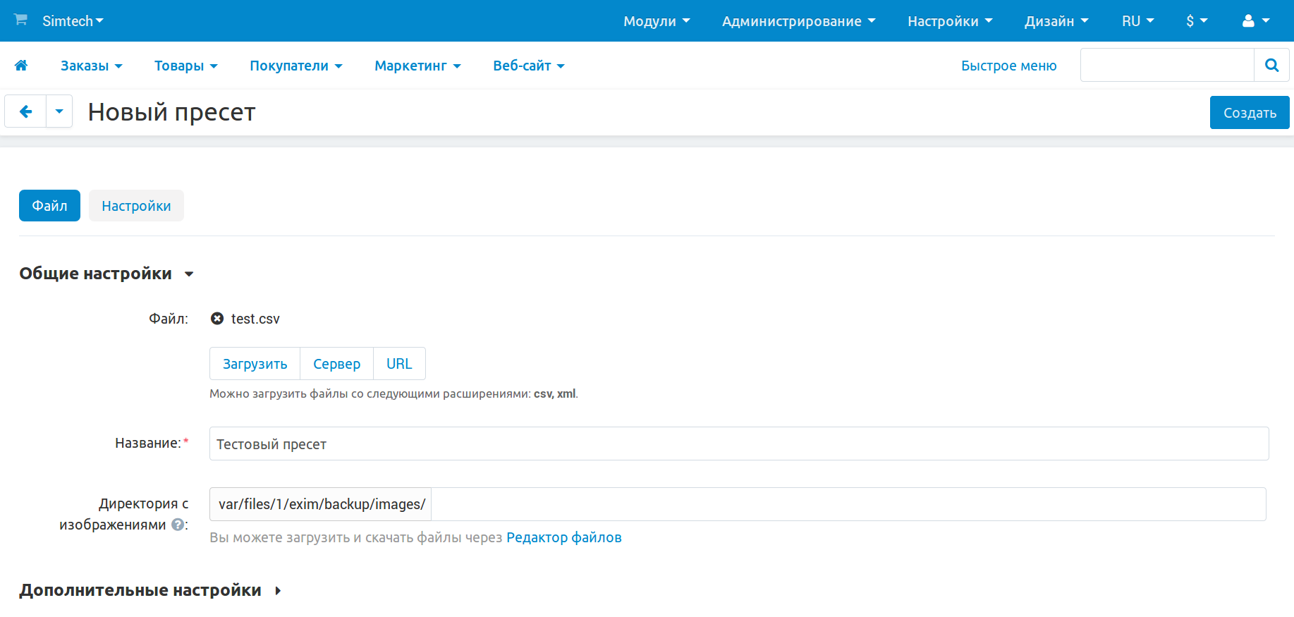 Настройте пресет импорта: выберите CSV- или XML-файл и введите название пресета (по нему вы потом сможете находить этот пресет среди других).