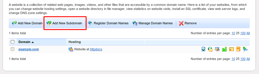 Аналогичным образом создаем два других поддомена. В результате мы должны увидеть все наши созданные поддомены в таблице внизу страницы: