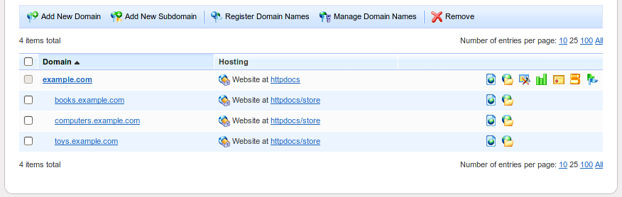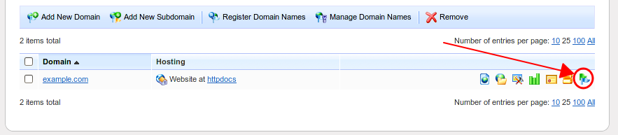 Если вы управляете несколькими сайтами через Plesk 10, то выберите тот, на который мы делаем привязку. В нашем случае - это example.com. Кликаем по ссылке Manage