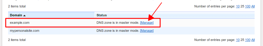2) Кликаем иконку Change DNS Zone Settings напротив домена example.com в таблице списка доменов.