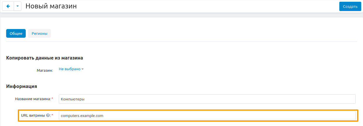 В качестве URL витриный мы указываем один из поддоменов, которые были созданы на Шаге 2.