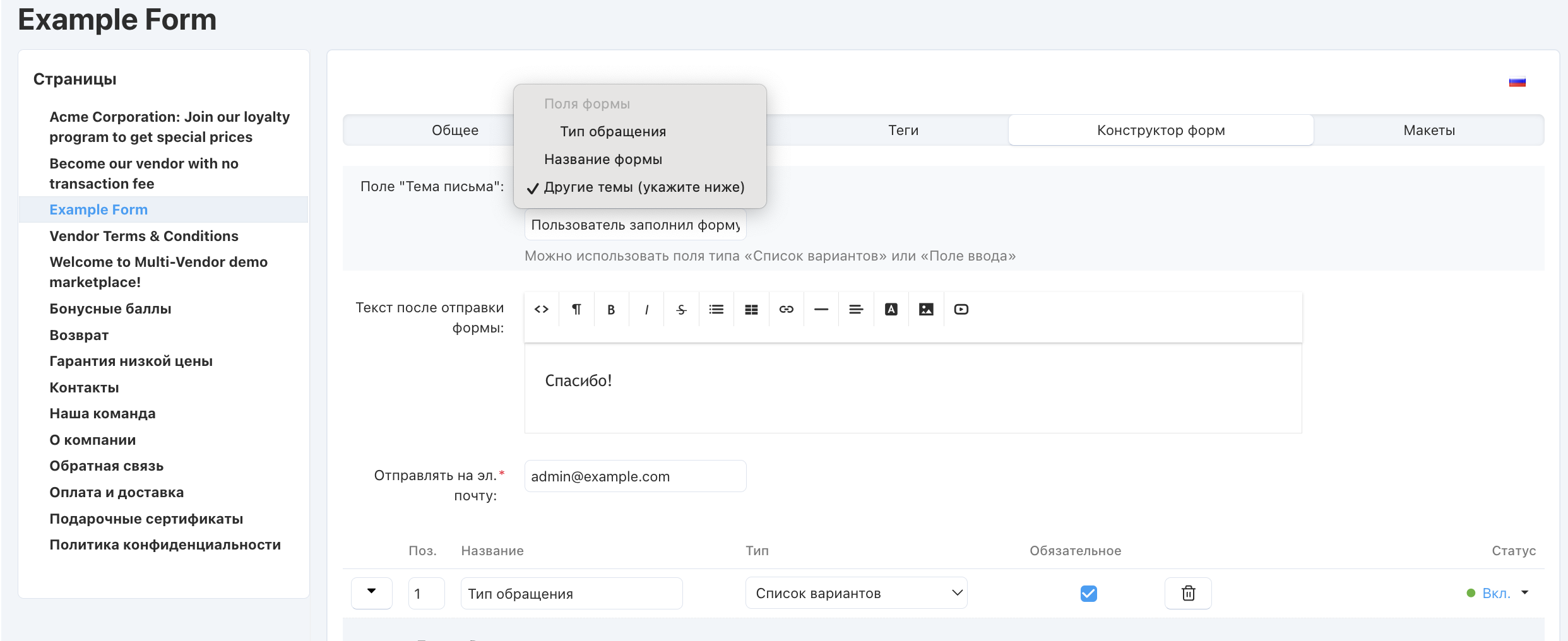 Когда вы редактируете уже созданную форму, в настройке Поле “Тема письма” появляется возможность выбрать одно из полей формы. Данное поле должно иметь один из следующих типов: