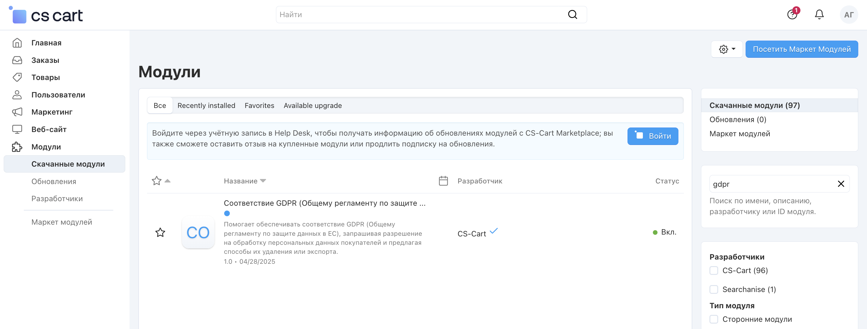 В панели администратора перейдите в раздел Модули → Скачанные модули.