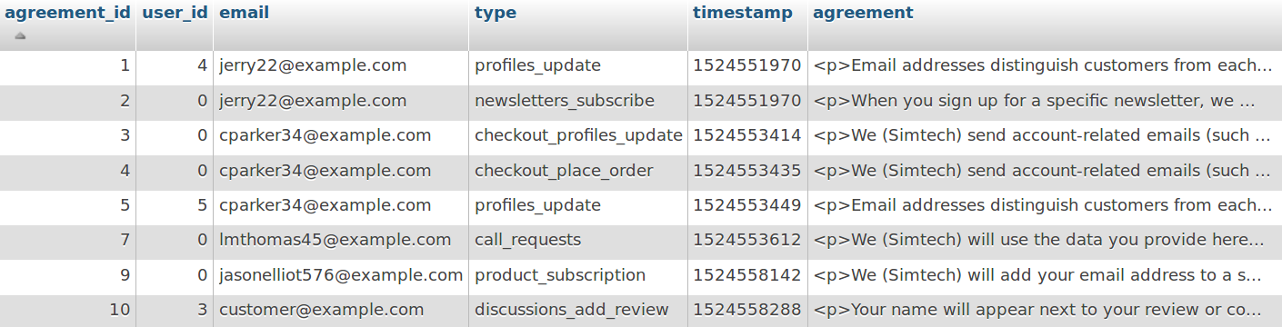 • Отдельная таблица в базе данных для регистрации того, на что человек дал согласие. Эта таблица называется cscart_gdpr_user_agreements. Она включает тексты уведомлений о персональных данных, какими они были на момент предоставления согласия. Эту информацию можно просмотреть только в базе данных напрямую.