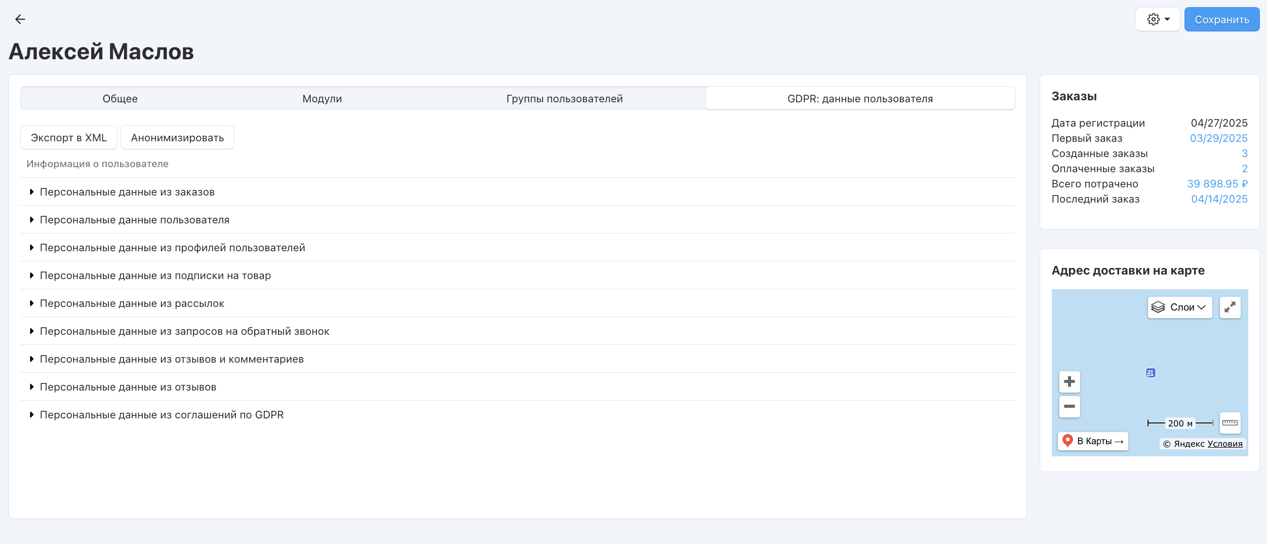 • Возможность экспортировать персональные данные покупателя в XML-файл по запросу.