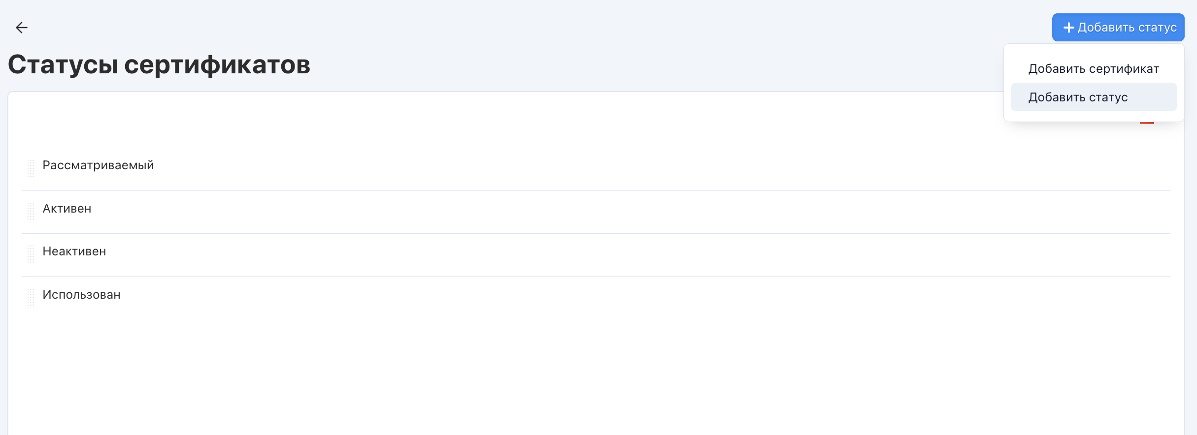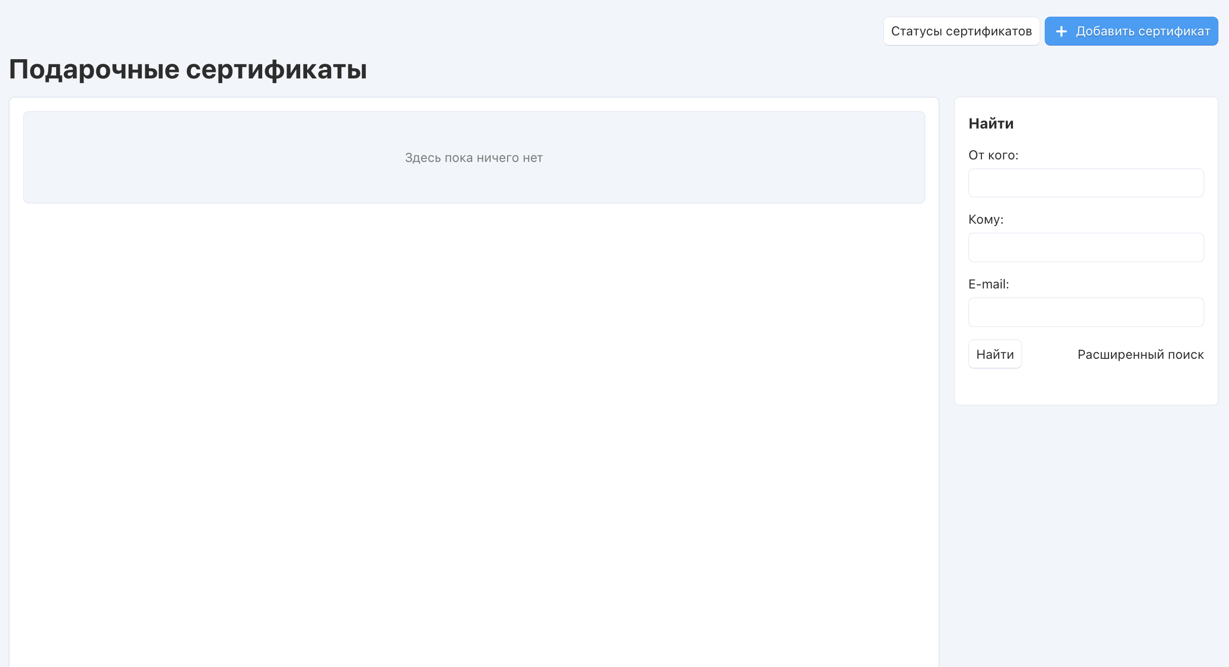 У каждого подарочного сертификата есть статус. Список возможных статусов находится на странице Настройки → Статусы → Статусы сертификатов.
