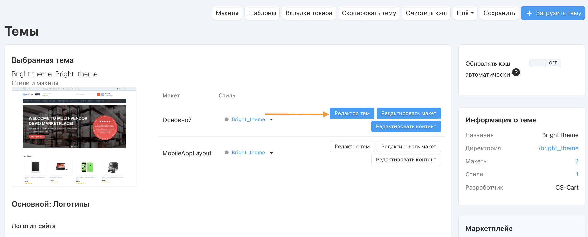 Нажмите кнопку Редактор тем рядом с макетом, который вы используете в магазине.
