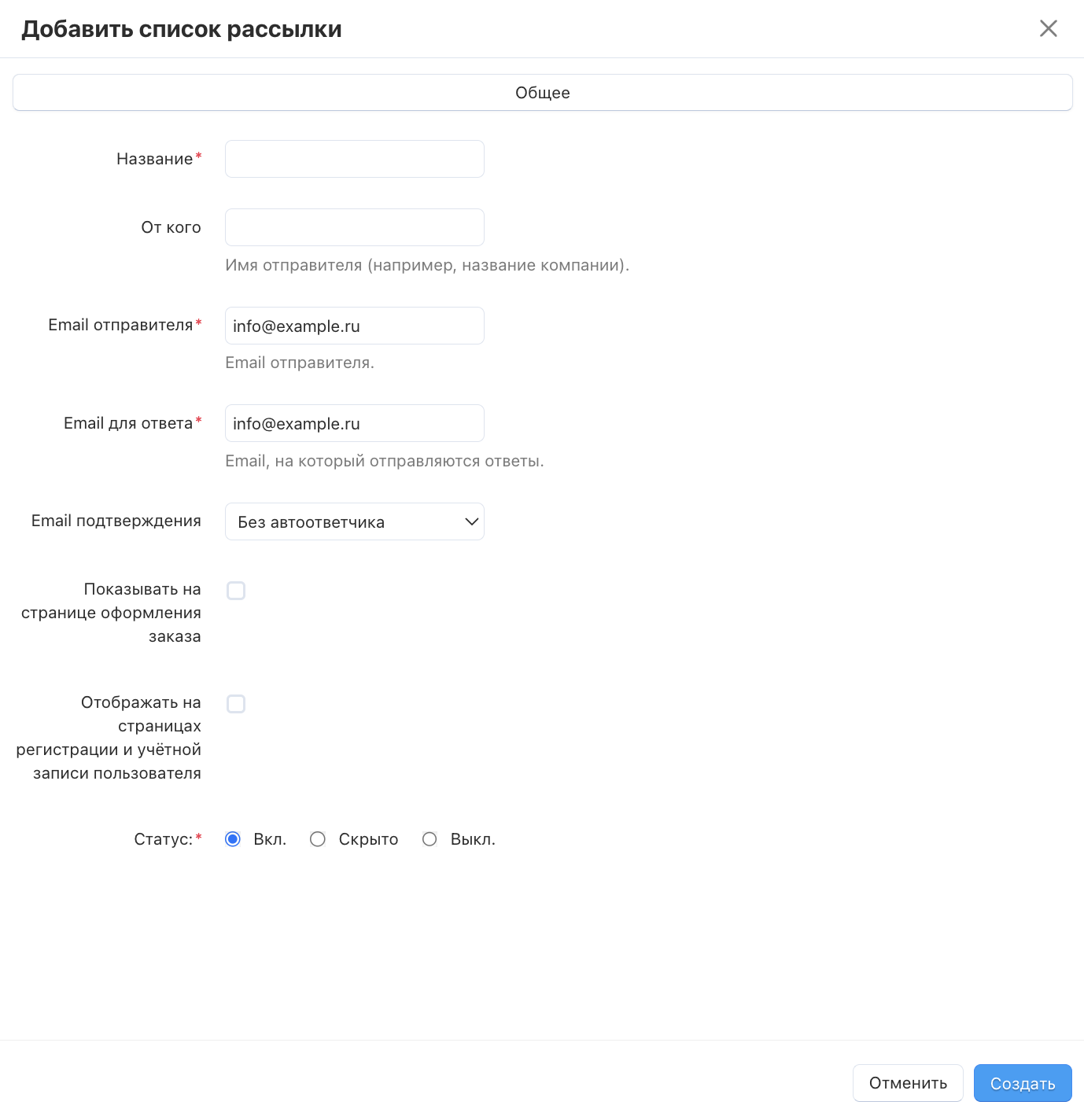 • Нажмите кнопку + Добавить список рассылки, чтобы добавить новый список рассылки.