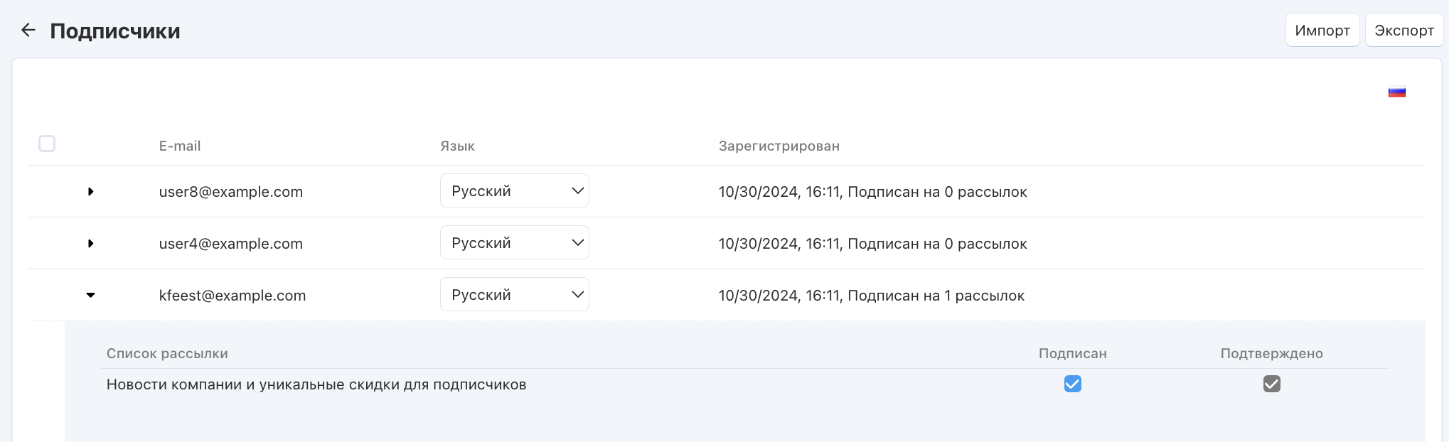 • Перейдите в раздел Маркетинг → Рассылки → Подписчики.