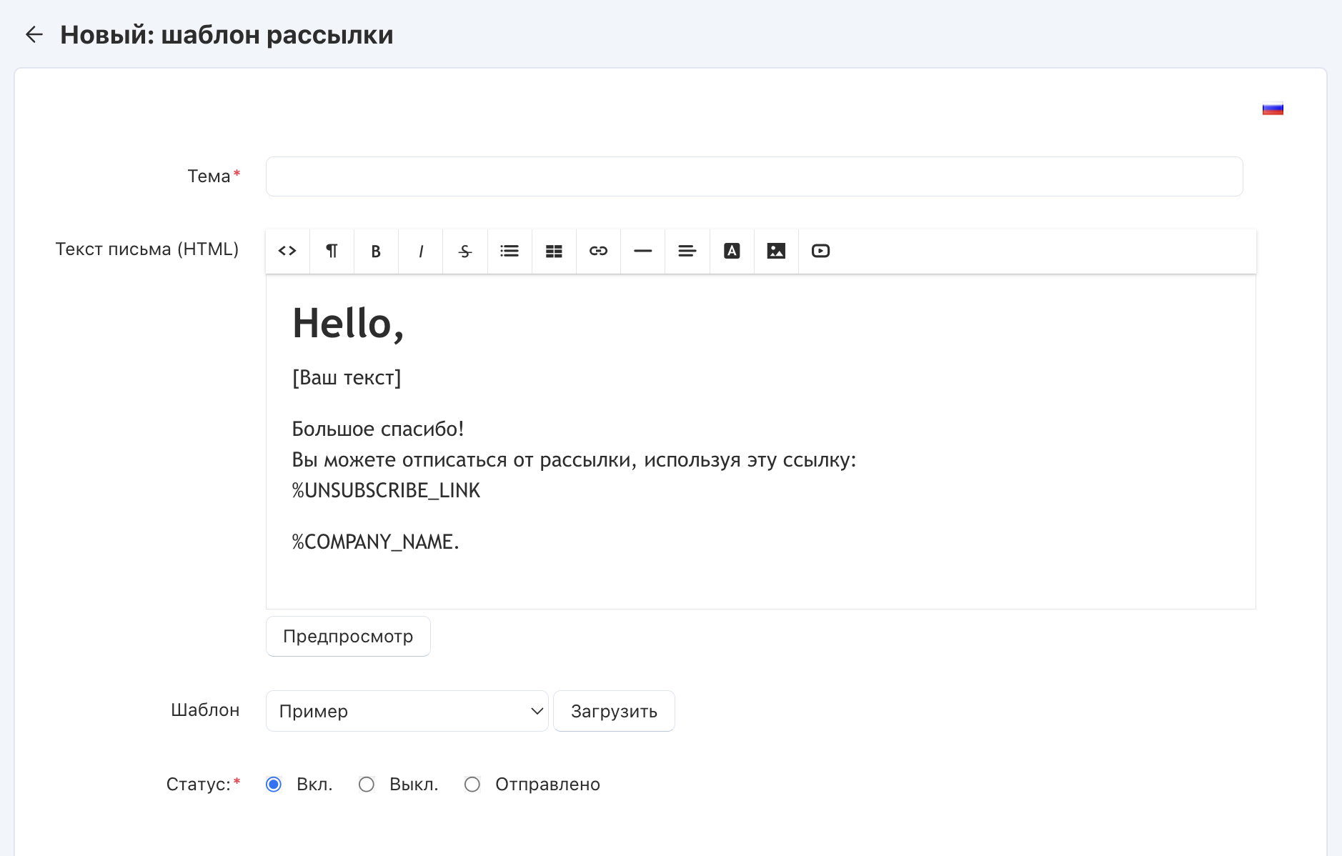 • Текст письма (HTML) — введите содержимое шаблона. Вы можете использовать визуальный редактор или ввести HTML-код.