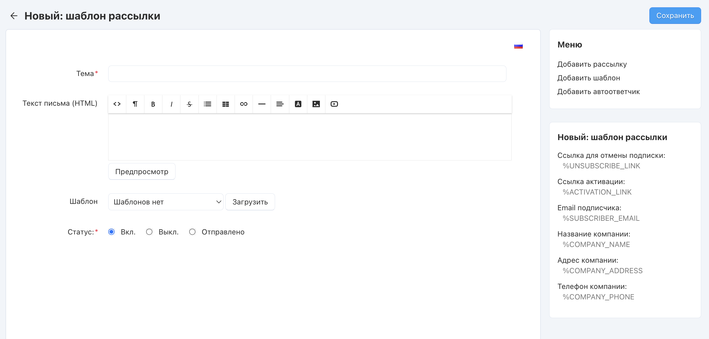 Создание шаблона рассылки