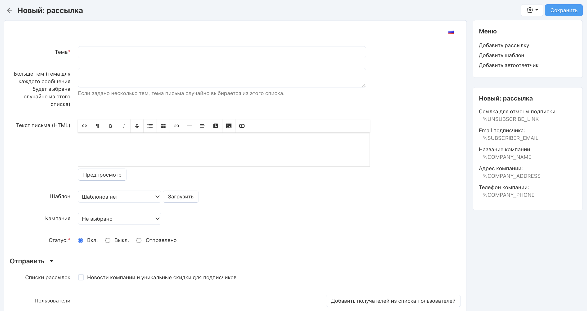 В панели администратора перейдите в раздел Маркетинг → Рассылки → Рассылки.