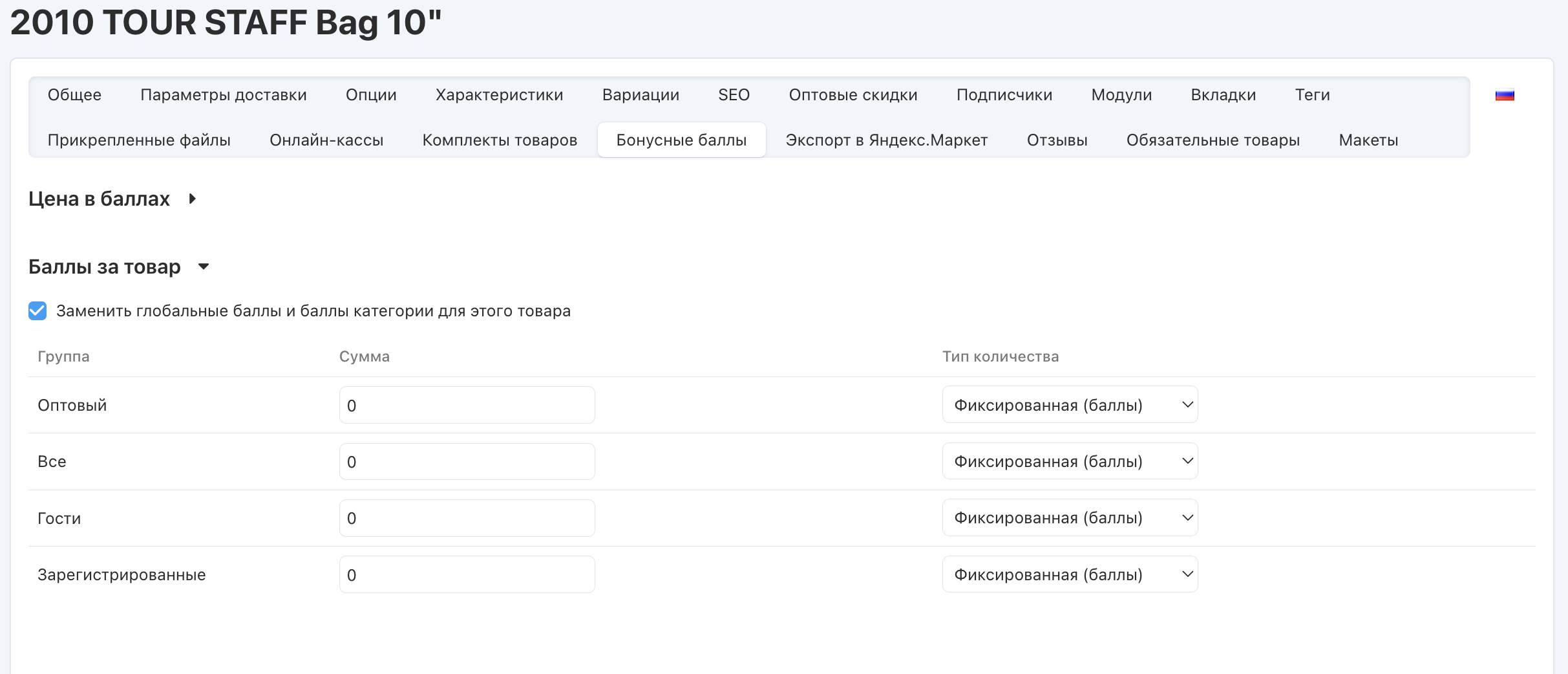 Откроется страница редактирования товара. Перейдите на вкладку Бонусные баллы.