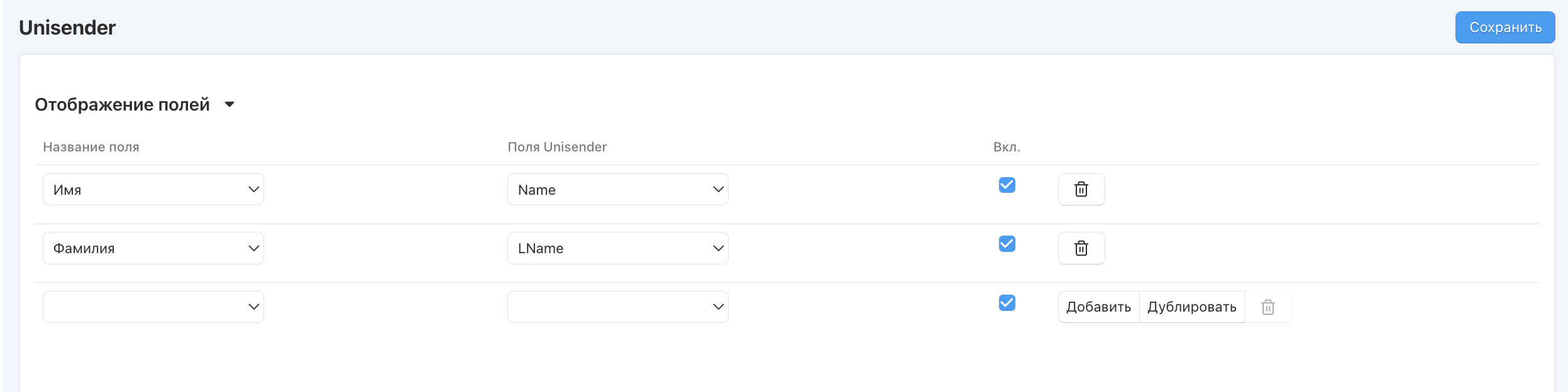 2. Настроить отображение полей на вашем сайте и в системе Unisender, выбрав нужные из списков.